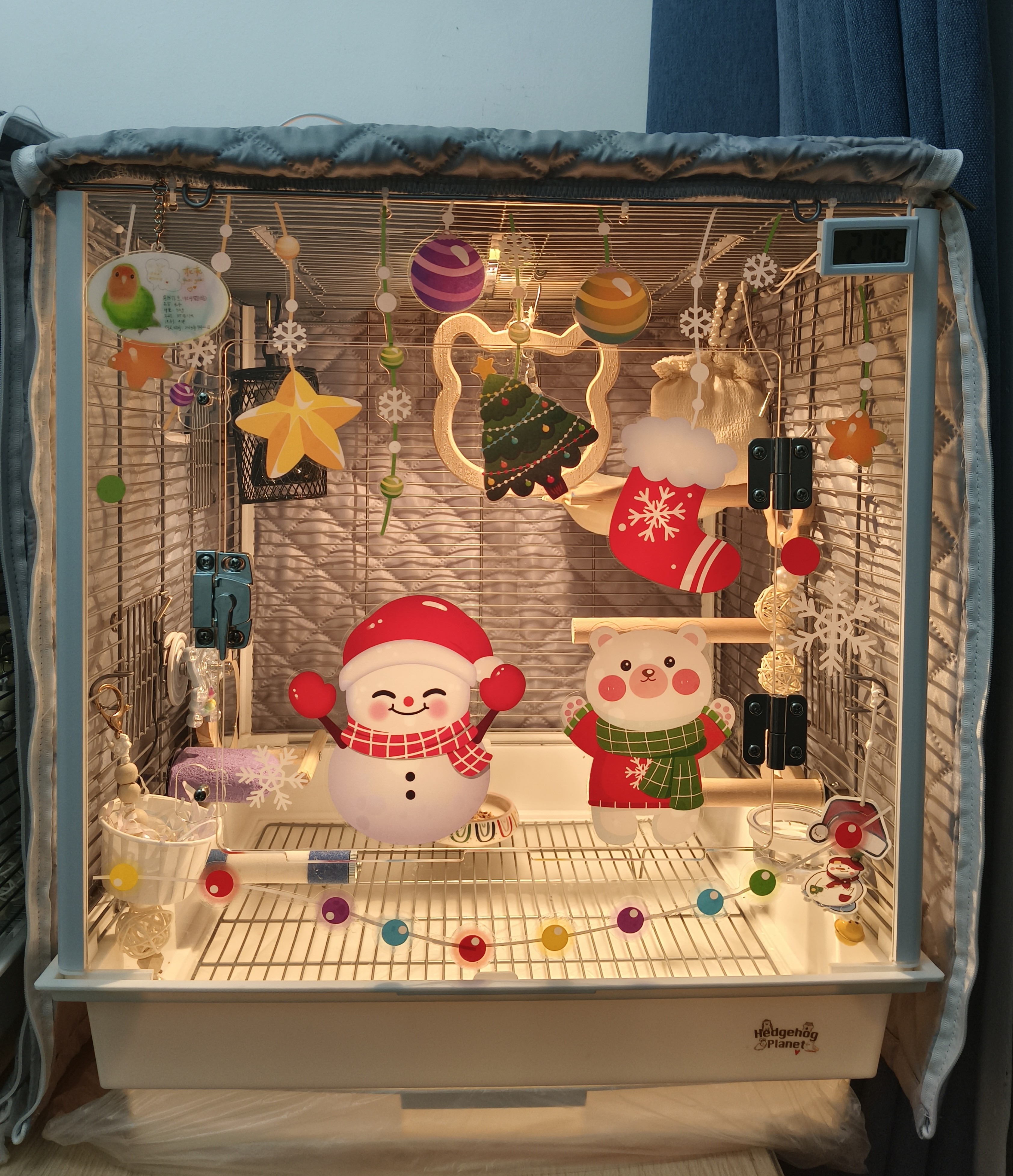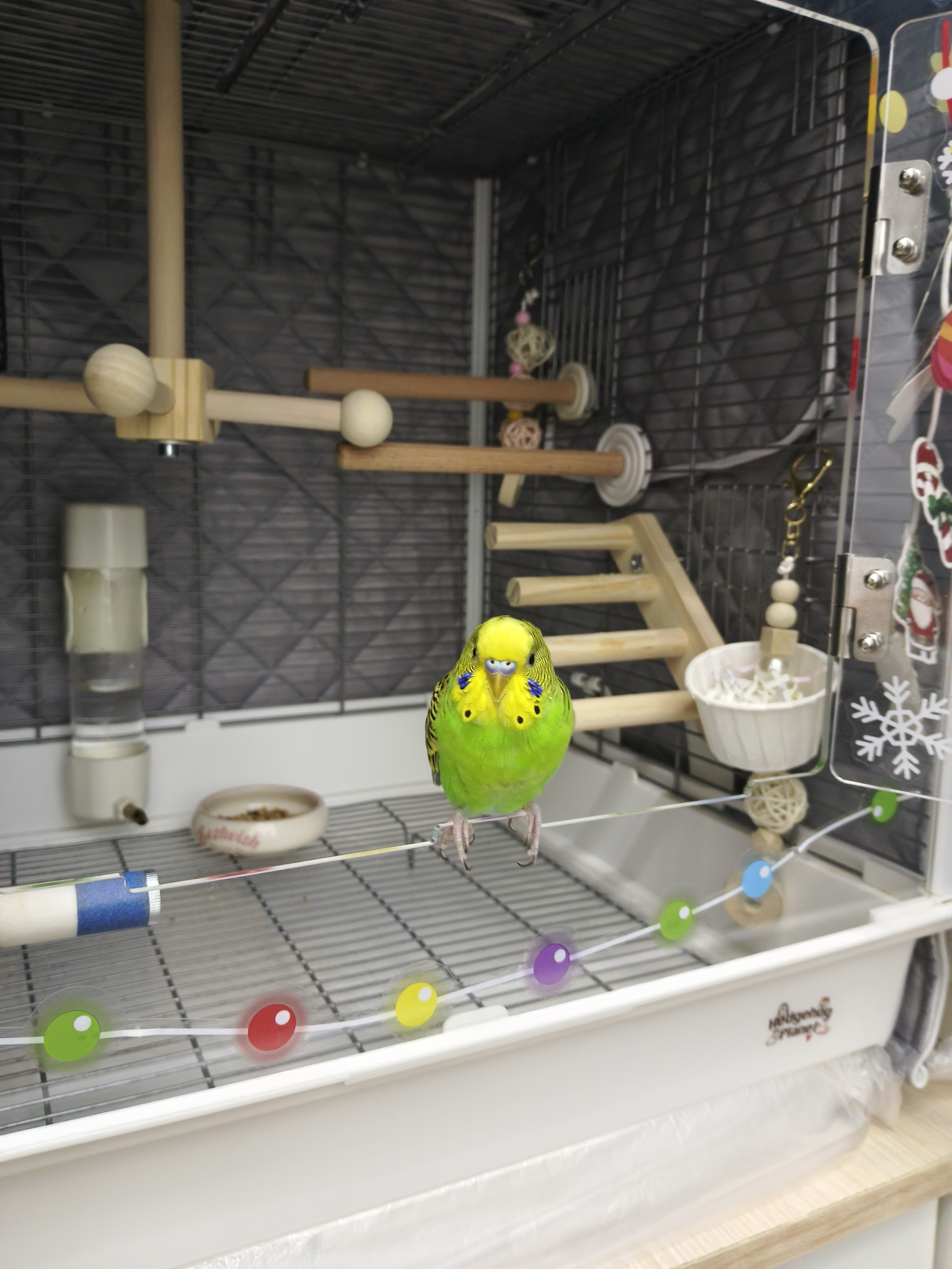 在圣诞节前,装饰了他们的笼子,拍了照很漂亮,我躺在沙发上休息一会儿,小绿不知道从什么缝隙里溜走了,等反应过来已经找不到了,,,